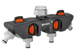 Met de GARDENA 4-weg waterverdeler kunt u gelijktijdig diverse accessoires aansluiten op één kraan. De waterafgifte kan voor elke aansluiting afzonderlijk worden geregeld of afgesloten. Op de 4-weg waterverdeler kunnen twee GARDENA besproeiingscomputers of watertimers worden aangesloten. De 4-weg waterverdeler kan met het Prof-System kraanstuk (art.nr. 2801-20) worden omgezet in het GARDENA Prof-System voor een grotere waterdoorvoer.De GARDENA 4-weg-waterverdeler is geschikt voor 26,5 mm (G3/4)-waterkraan met en 33,3 mm (G 1)-draad en 21 mm (G 1/2)-waterkraan met 26,5 mm (G 3/4)-draad.